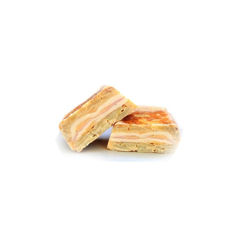 Patatas, jamón cocido 22%, QUESO 18%, HUEVO, cebolla, aceite de oliva, sal.
